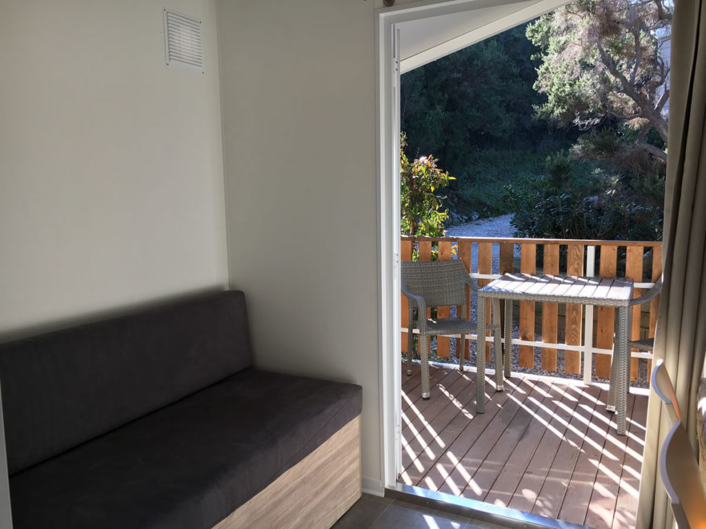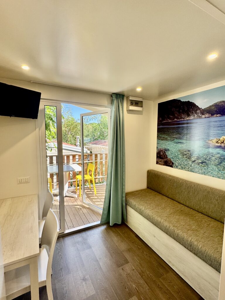 La Mobilehome De Lux (Tipo A) dispone di 4+1 posti letto, due camere: una con letto grande e l’altra con due lettini separati (accoppiabili). Il quinto Ospite dispone di un comodo divano nella dinette. Piacevole sala d’ingresso con ampia vetrata, spazioso piano cottura con lavello e piastra quattro fuochi gas, frigorifero alto con cella freezer, tavolo con sedie. Ampio bagno con lavandino, wc e comoda cabina doccia. Set tavolo e sedie anche in veranda. Le strutture dispongono di aria condizionata/climatizzatore e TV satellitare. Le vicinissime spiagge Sansone e Sorgente si raggiungono a piedi in cinque minuti.